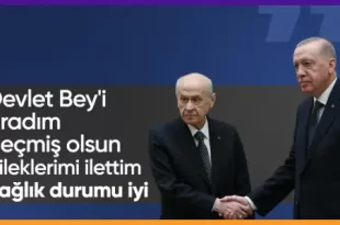 Cumhurbaşkanı Recep Tayyip Erdoğan, Devlet Bahçeli ile telefon görüşmesi gerçekleştirdiğini ve sağlık durumunun iyi olduğunu belirtti. Cumhurbaşkanı Recep Tayyip Erdoğan, AK Parti İstanbul 8. Olağan İl Kongresi’nde yaptığı konuşmada, MHP Genel Başkanı Devlet Bahçeli ile bir telefon görüşmesi gerçekleştirdiğini ve sağlık durumunun iyi olduğunu belirtti. “DURUMUNUN İYİ OLDUĞUNU BİZZAT KENDİSİNDEN …