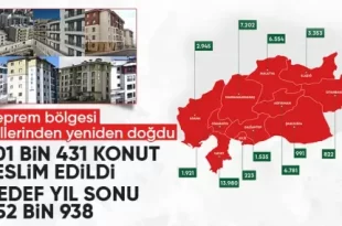 6 Şubat 2023 tarihinde Kahramanmaraş merkezli meydana gelen iki büyük deprem, 11 ili derinden etkiledi. Depremzedeler için yeni evler ve iş yerleri inşa edilerek, bu yapılar birer birer sahiplerine teslim ediliyor. Bugüne kadar toplamda 201 bin konut teslim edilerek, bölgedeki yaraların sarılmasına büyük bir adım atıldı. Kahramanmaraş ve çevresindeki depremzedeler …