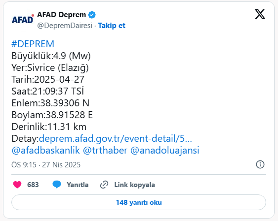 Son dakika deprem verilerine göre Elazığ’da deprem meydana geldi. Sarsıntının ardından AFAD ve Kandilli Rasathanesi’nin verileri açıklaması bekleniyor.