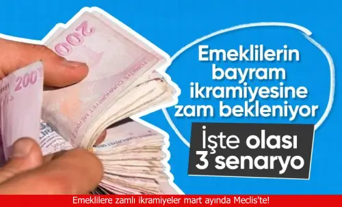 Emekli maaşlarına yapılan ek zammın belirlenmesinin ardından, emeklilerin bayram ikramiyelerine de zam söz konusu.. Düzenlemenin mart ayında Meclis gündemine gelmesi planlanırken, ikramiyenin kaç lira olacağıyla ilgili kamuoyunda üç senaryo dile getiriliyor.