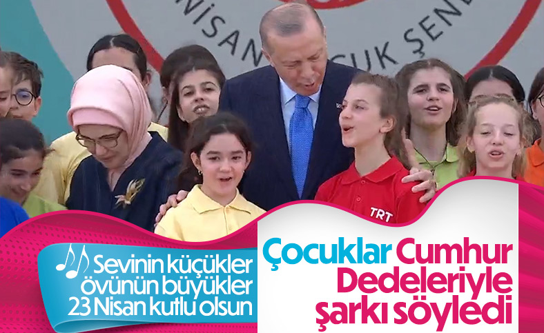 Konuşmalarının ardından çocukları sahneye alan Cumhurbaşkanı, çocukların 23 Nisan şarkısına eşlik etti.
