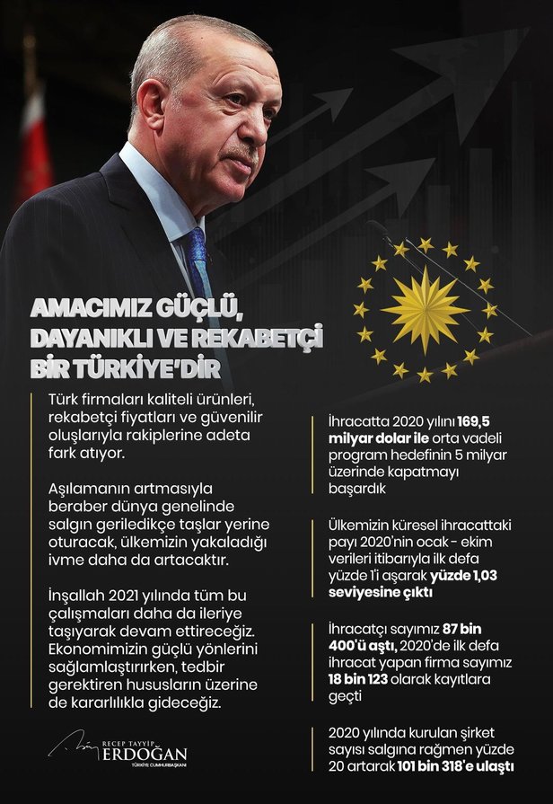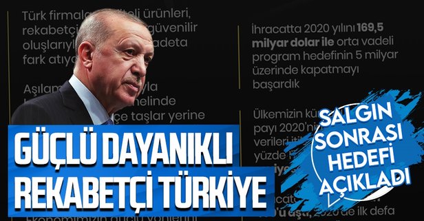 Başkan Erdoğan, yaptığı paylaşımda, “Amacımız Türkiye’nin salgın sonrası döneme güçlü, dayanıklı ve rekabetçi bir küresel oyuncu olarak girmesini sağlamaktır.