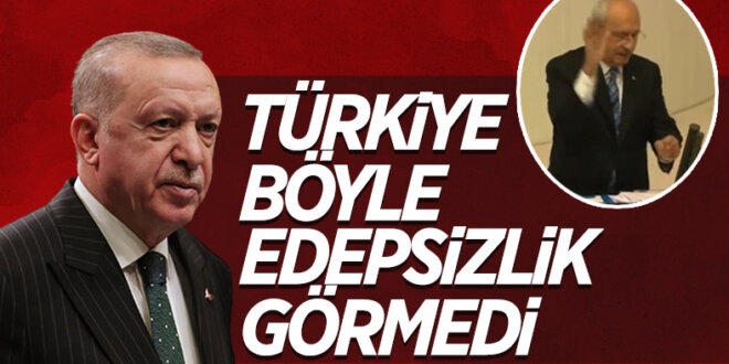 Cumhurbaşkanı Erdoğan, Meclis kürsüsünde yaptığı el hareketiyle tartışılan CHP lideri Kemal Kılıçdaroğlu hakkında “Genel Kurul, edepsizlik örneğiyle sarsıldı” dedi.
