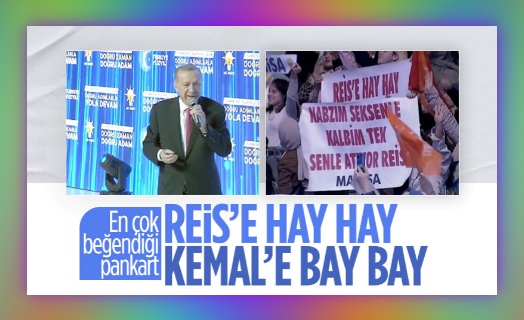 Ankara’da partisinin aday tanıtım toplantısında konuşan Cumhurbaşkanı Erdoğan, Manisa’dan gelen partililerin ‘Reis’e hay hay, Kemal’e bay bay’ yazılı pankartını beğenerek okudu.