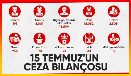 Polis ekiplerinin operasyonunda tutuklanan 105 bin 249 şüphelinin 6 bin 168’ini rütbeli olmak üzere 15 bin 32’sini polis, 191’ini general, 8 bin 81’ini subay, 13 bin 599’unu diğer görevlerde olan asker, 2 bin 305’ini hakim, 938’ini savcı, 24’ünü vali, 93’ünü vali yardımcısı, 19’unu mülkiye müfettişi, 174’ünü kaymakam, 64 bin 793’ünü de diğer meslek grupları oluşturdu.