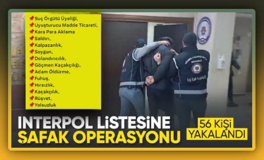 İnterpol tarafından aranan ve Emniyetimizin yaptığı titiz incelemelerden sonra Ülkemizde olduğu belirlenen 56 kişinin tamamı yakalandı. Emniyet güçlerimiz taramalarına devam ediyor.