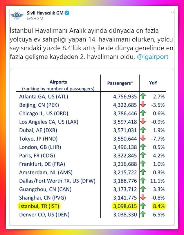 “İstanbul Havalimanı aralık ayında dünyada en fazla yolcuya ev sahipliği yapan 14. havalimanı olurken, yolcu sayısındaki yüzde 8,4’lük artış ile de dünya genelinde en fazla gelişme kaydeden 2. havalimanı oldu. Avrupa havalimanları içinde Londra Havalimanı yüzde 0,5, Paris Havalimanı yüzde 4,2, Frankfurt Havalimanı yüzde 1, Amsterdam Havalimanı ise yüzde 0,3 oranında yolcusunu arttırdı. Avrupa’nın en büyük 5 havalimanı içinde yolcusunu en çok arttıran Nisan 2019’da uçuşların başladığı İstanbul Havalimanı, ağustos itibarıyla 15. sıradan dünyanın en fazla yolcu taşıyan havalimanları listesine girmiştir. Eylülde 15, Ekim’de 12, Kasım’da 11. sırada yer alarak, Atatürk Havalimanı’nın 2018’deki listedeki yerini muhafaza etmiştir.”