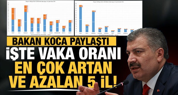 Koca paylaşımında “Son hafta 100.000 nüfusta vaka görünme oranı en çok artan illerimiz: Sinop, Kilis, Samsun, Amasya ve Edirne. En çok azalan illerimiz: Ordu, Bolu, Trabzon, Nevşehir ve Karaman. Birlikte tedbirlere uyarak tüm illerimizi mavi kategoriye sokalım.” ifadelerini kullandı.