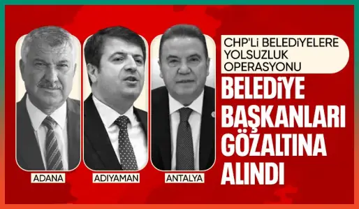 Adıyaman Belediye Başkanı Abdurrahman Tutdere, Antalya Büyükşehir Belediye Başkanı Muhittin Böcek ve Adana Büyükşehir Belediye Başkanı Zeydan Karalar sabah saatlerinde gözaltına alınırken, polisin belediye binalarında yaptıkları aramaların sürdüğü öğrenildi.