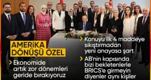ABD ziyaretinde gazetecilerle bir araya gelen Cumhurbaşkanı Recep Tayyip Erdoğan; İsrail’in Gazze’de yaptığı soykırım, ABD’deki seçim, Türkiye’nin BRICS üyeliği, yeni Anayasa çalışmaları ve ekonomiye dair önemli mesajlar verdi. Birleşmiş Milletler (BM) 79’uncu Genel Kurulu vesilesiyle ABD’nin New York şehrine giden Cumhurbaşkanı Recep Tayyip Erdoğan, yoğun temaslarını tamamlayarak yurda geri döndü.. …