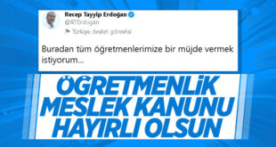 Cumhurbaşkanı Erdoğan resmi Twitter hesabından yaptığı paylaşımda öğretmenlere müjdeli haberi duyurdu. Erdoğan, "Öğretmenlik Meslek Kanunu teklifimiz TBMM’ye sunuldu.'' ifadelerini kullandı. Cumhurbaşkanı Erdoğan, Öğretmenlik Meslek Kanunu teklifinin TBMM'ye sunulduğunu duyurdu. Öğretmenlere mali ve sosyal haklar sağlayan Öğretmenlik Meslek Kanunu teklifi TBMM'de.. "TÜM ÖĞRETMENLERİMİZE MÜJDE VERMEK İSTİYORUM" "Buradan tüm öğretmenlerimize bir müjde vermek istiyorum" diyen Cumhurbaşkanı Erdoğan, sosyal [...]