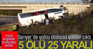 Sarıyer Kuzey Marmara Otoyolu’nda yolcu otobüsünün yoldan çıktığı kazada 5 kişi yaşamını yitirdi, 25 kişi yaralanırken, yaralılardan 7’sinin durumunun ağır olduğu bildirildi. Kuzey Marmara Otoyolu’nda yolcu otobüsü yoldan çıktı.Karabük’ten İstanbul’a gitmekte yolcu otobüsü, Kuzey Marmara Otoyolu Sarıyer mevkiinde, sürücüsünün direksiyon hâkimiyetini kaybetmesi sonucu kaza yaptı. 5 KİŞİ ÖLDÜ, 25 KİŞİ …