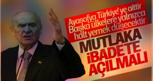 MHP Genel Başkanı Bahçeli, ”Ayasofya Camisi’nin tasarruf hakkı sadece Türkiye’ye aittir. Ayasofya Camisi Müslüman gönüllerle buluşmalı, kapısı ibadete mutlaka açılmalıdır. Müzeden cami, camiden de müze olamayacaktır” dedi. MHP Genel Başkanı Bahçeli, “MHP’nin görüşü çok nettir. Ayasofya Camisi, Müslüman gönüllerle buluşmalı, kapısı ibadete mutlaka açılmalıdır.” dedi. MHP Genel Başkanı Devlet Bahçeli, …
