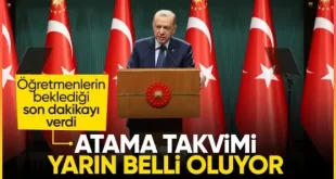Cumhurbaşkanı Erdoğan, “Milli Eğitim Bakanlığımız yarın atamaya esas branş dağılımını, başvuru takvimini ve süreci paylaşacaktır” dedi. Öğretmenlerin heyecanla beklediği müjdeyi Cumhurbaşkanı Erdoğan duyurdu.. Cumhurbaşkanı Recep Tayyip Erdoğan’ın başkanlığında yapılan kabine toplantısının ana gündemlerinde biri de öğretmen atamalarıydı. Kabine toplantısı sonrası açıklamalarda bulunan Cumhurbaşkanı Erdoğan, atanacak öğretmen sayısı ve branş bazında …