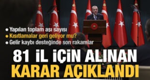 Cumhurbaşkanı Erdoğan, koronavirüs tedbirleriyle ilgili, 'Şehirlerimizdeki mevcut uygulamayı bir süre daha sürdürme ve gelişmeleri yakın takip etme kararı aldık.' dedi. Erdoğan ayrıca bugün itibarıyla yapılan aşı sayısının 11 milyon 500 bine ulaştığı bilgisini aktardı. Cumhurbaşkanı Recep Tayyip Erdoğan başkanlığındaki Kabine toplantısı sona erdi. Toplantı 3 saat sürdü. Salgındaki son tabloya göre alınan kararları Cumhurbaşkanı Erdoğan [...]