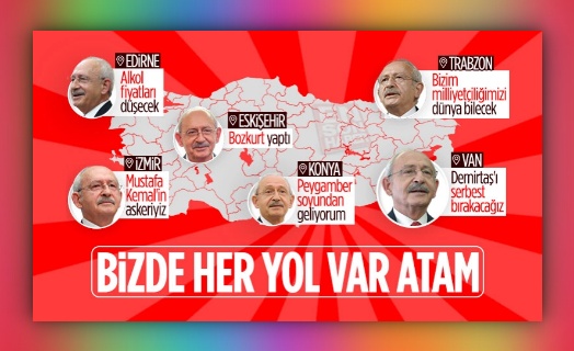 Miting yaptığı her ilde inanç ve sosyal yapısına göre vaatlerini değiştirmesi, muhalefetin adayı Kemal Kılıçdaroğlu’nun seçim kampanyasının öne çıkan özelliği oldu. Konya’da peygamber soyundan geldiğini söyleyen Kılıçdaroğlu, Edirne’de alkol fiyatlarına indirim vaat etti.