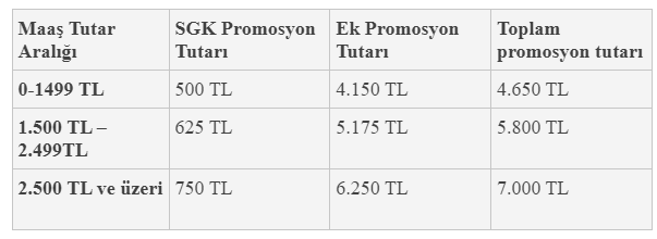 Promosyon taahhütnamesinin imzalanması sonrasında ek bir koşul olmadan; bir aylık net gelir 1.500 TL’ye kadarsa 3.500 TL, 1.500 TL-2.500 TL arasındaysa 4.250 TL, 2.500 TL’nin üzerindeyse 5.000 TL nakit promosyon ödenir.