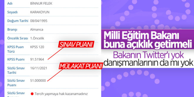 KPSS’de 91 puan almasına rağmen mülakatta 51 puan verilmesi nedeniyle öğretmenlik hayali suya düşen Binnur Karakoyun’un isyanı, sosyal medyada büyük yankı uyandırırken, bu adaletsizliğin Reise karşı yapılmış bir sabotaj olduğu vurgulandı.