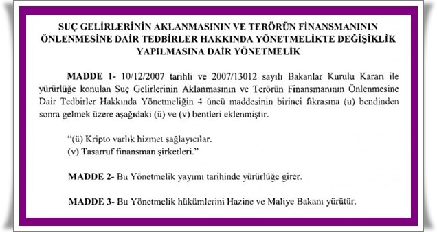 Cumhurbaşkanlığı kararıyla “kripto varlık hizmet sağlayıcıları”, suç gelirlerinin aklanmasının ve terörün finansmanının önlenmesine dair tedbirler yönetmeliğine dahil edildi.