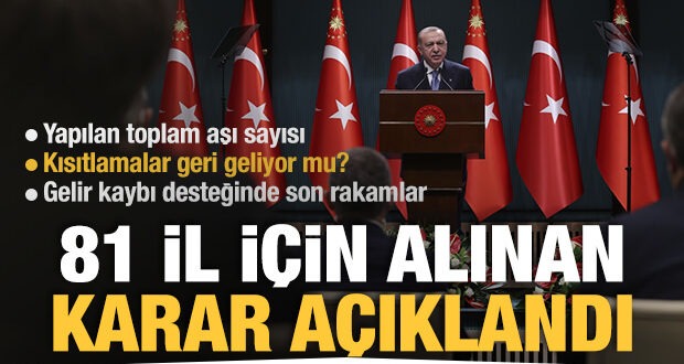 Cumhurbaşkanı Erdoğan, koronavirüs tedbirleriyle ilgili, ‘Şehirlerimizdeki mevcut uygulamayı bir süre daha sürdürme ve gelişmeleri yakın takip etme kararı aldık.’ dedi. Erdoğan ayrıca bugün itibarıyla yapılan aşı sayısının 11 milyon 500 bine ulaştığı bilgisini aktardı.