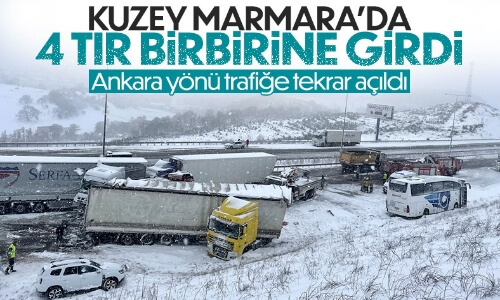 Kuzey Marmara Otoyolu’nda kar nedeniyle 4 tır, 2 yolcu otobüsü ve kar küreme aracının karıştığı zincirleme kaza meydana geldi.3 kişinin yaralandığı kaza nedeniyle bölgede trafik yoğunluğu oluştu.
