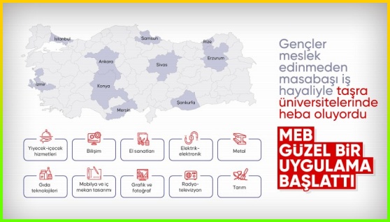 Ortaokul 7. sınıftan itibaren öğrencilerin meslek liselerinde ücretsiz katılabileceği uygulama İstanbul, Ankara, İzmir, Erzurum, Konya, Mersin, Rize, Samsun, Sivas ve Şanlıurfa olmak üzere 10 ilde 196 okulda başlatılacak. Pilot uygulamanın, ülke geneline yaygınlaştırılması için çalışmalar yürütülecek.