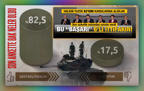 Sınır ötesinde terör yuvalarına yapılan operasyonu sorgulayan 6’lı ittifakın son bildirisine en güzel cevap halktan geldi. Son anket Türk halkının yüzde 82,5’inin sınır ötesi operasyonu desteklediğini ortaya koydu.