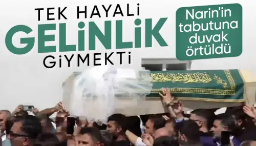 Minik Narin’in tabutunda ise bir detay göze çarptı. Narin’in ölmeden önce gelinlik giymeyi çok istiyordu. Narin’in tabutuna duvak sarıldı.