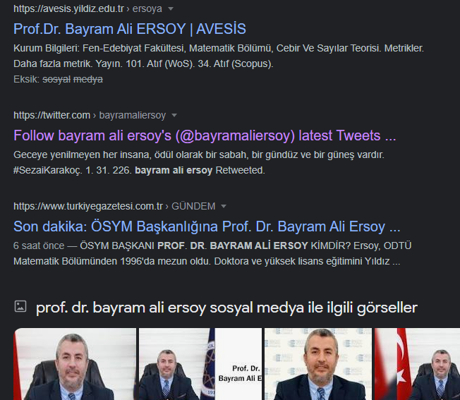 Kendisiyle ilgili fazla bilgi sahibi olmak isteyenler Prof. Dr. Bayram Ali Ersoy’u tanımak için sosyal medyaya koştu. Biz de diğer kullanıcılar gibi Prof. Dr. Bayram Ali Ersoy’u okuyucularımıza daha iyi tanıtmak için sosyal medyada bir takım araştırmalar yaptık. Yapmış olduğumuz araştırmalar sonucu Prof. Dr. Bayram Ali Ersoy’un twetter hesabının kapatıldığını sadece avesis.yildiz.edu.tr/ersoya hesabının açık olduğunu gördük.