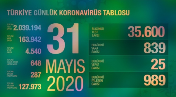 Türkiye’de koronavirüs salgınında iyileşenlerin sayısı 127 bin 973 oldu. Virüs bu gün de 25 can daha aldı. Bakan Fahrettin Koca yaptığı açıklamada,” Solunum desteğine ihtiyaç duyan hasta sayısı azalmaya devam ediyor” dedi.