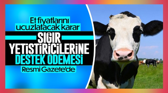 Cumhurbaşkanlığı kararıyla, 2 Nisan ve 1 Mayıs tarihleri arasında, Et ve Süt Kurumu tarafından kesimi ve satışı yapılan sığır başına, yetiştiricilere 2 bin 500 lira ödeme yapılacak.