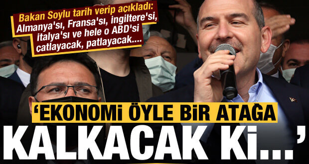 İçişleri Bakanı Süleyman Soylu, “Temmuz ayından itibaren ülkemin ekonomisi öyle bir atağa kalkacak, etrafımızdaki Almanya’sı, Fransa’sı, İngiltere’si, İtalya’sı ve hele o her şeye burnunu sokan ABD’si de çatlayacak, patlayacak. dedi.