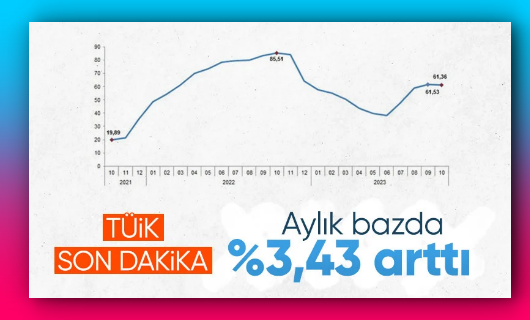 TÜFE’deki değişim 2023 yılı Ekim ayında, bir önceki aya göre yüzde 3,43, bir önceki yılın aralık ayına göre yüzde 55,00, bir önceki yılın aynı ayına göre yüzde 61,36 ve on iki aylık ortalamalara göre yüzde 54,26 olarak gerçekleşti.
