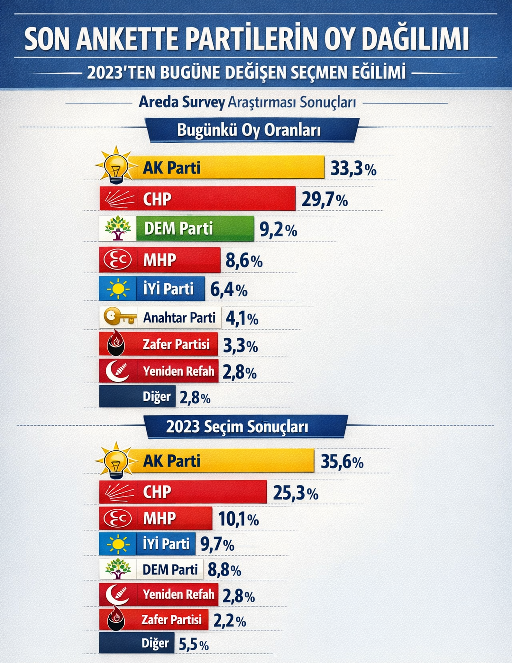 Son genel seçim sonuçları ile karşılaştırıldığında bazı partilerin oy oranlarında dikkat çekici değişimler görülüyor. 2023 seçimlerindeki oranlar ise şöyleydi: