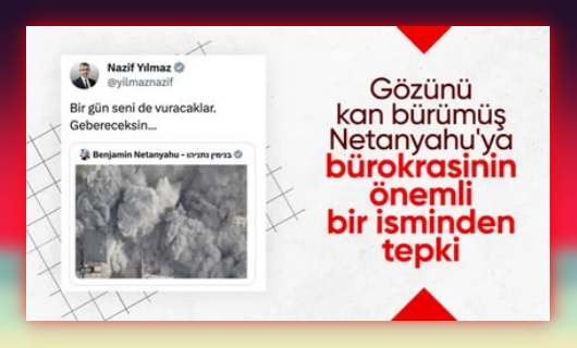 İsrail Başbakanı Binyamin Netanyahu, savaş uçaklarının Gazze’yi bombaladığı anları paylaşarak, “Tüm gücümüzle devam edelim” notunu ekledi. Bu paylaşımı alıntılayan Milli Eğitim Bakan Yardımcısı Nazif Yılmaz, “Gebereceksin” diyerek tepki gösterdi.