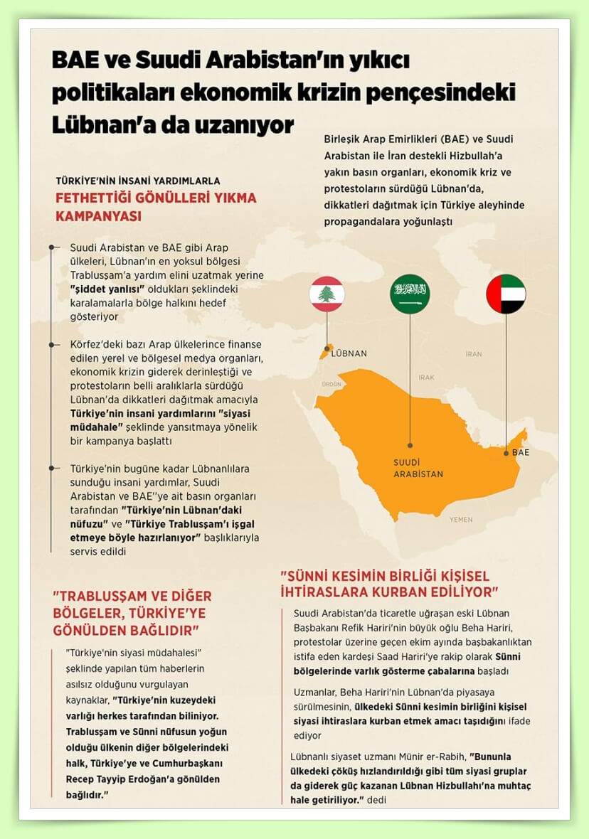 6Arap ülkesinden (Bahreyn, Kuveyt, Umman, Katar, Suudi Arabistan ve BAE) oluşan Arap konseyi ABD’nin “Lübnan halkı çok sıkıntı çekti ve taleplerine kulak verecek liderlere sahip olmayı hak ediyor” açıklamasından sonra protesto gösterilerine destek açıklaması yaptı.